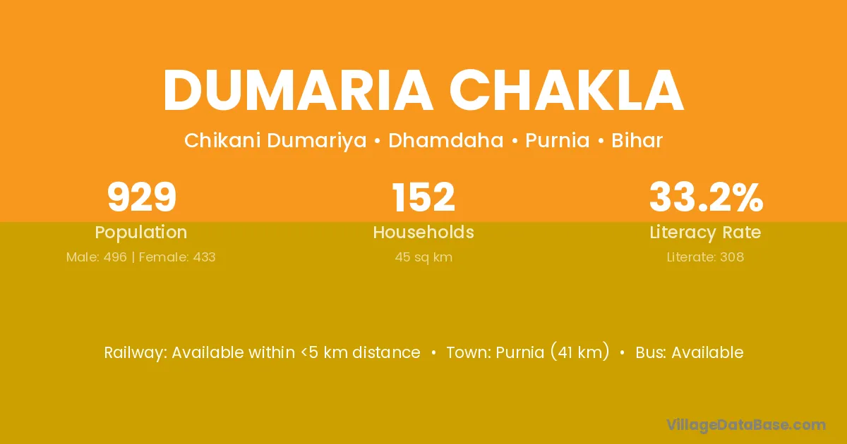 Purnia (41 km) is the nearest town to Dumaria Chakla village for major economic activities and is located approximately 41 km away.