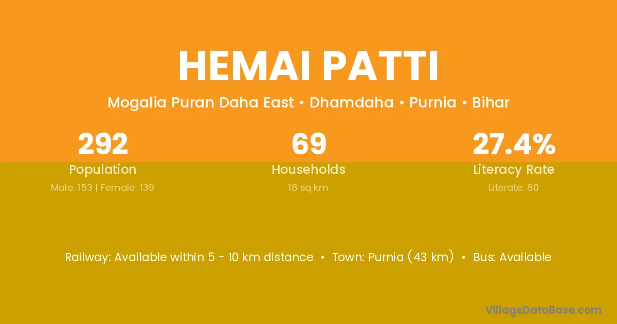 Purnia (43 km) is the nearest town to Hemai Patti village for major economic activities and is located approximately 43 km away.