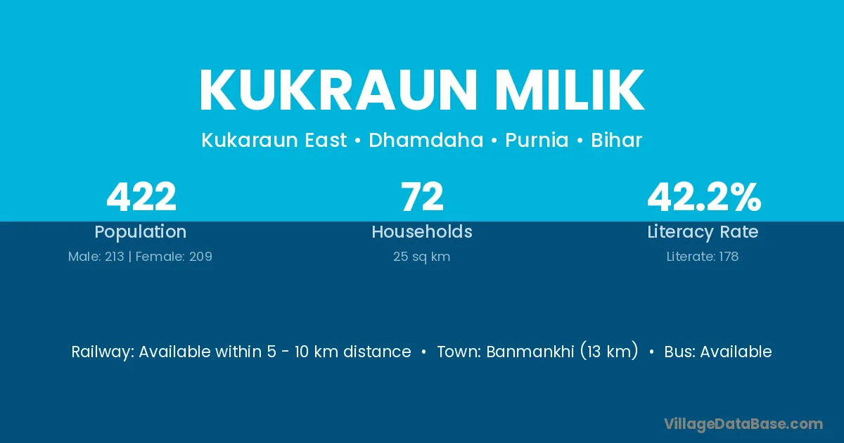 Banmankhi (13 km) is the nearest town to Kukraun Milik village for major economic activities and is located approximately 13 km away.