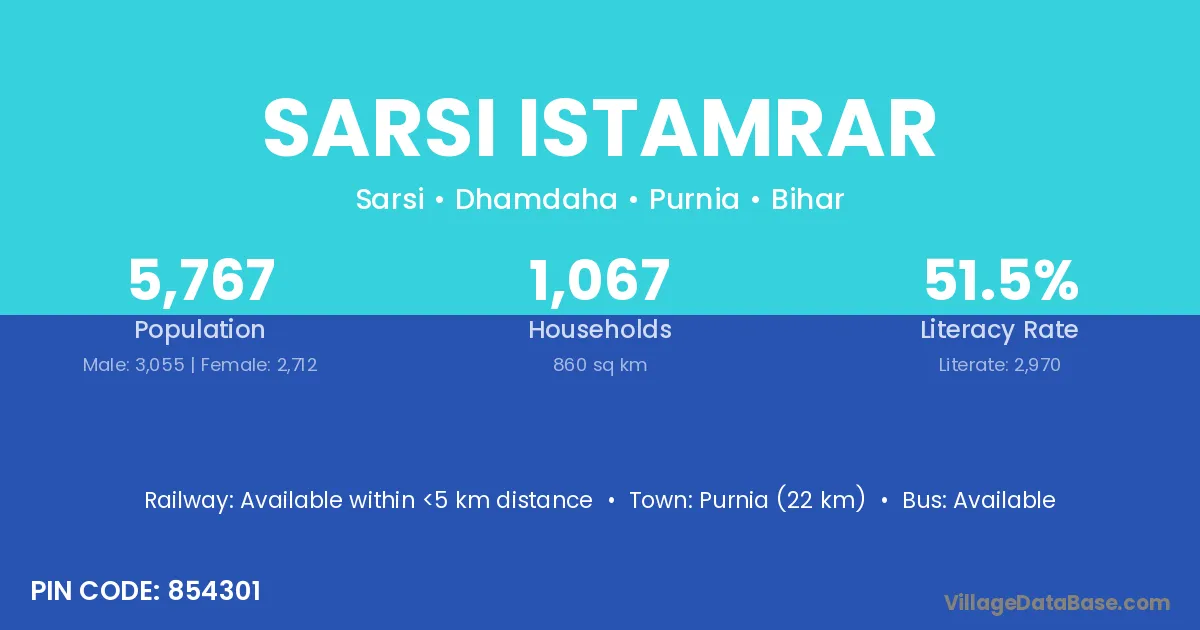 Purnia (22 km) is the nearest town to Sarsi Istamrar village for major economic activities and is located approximately 22 km away.