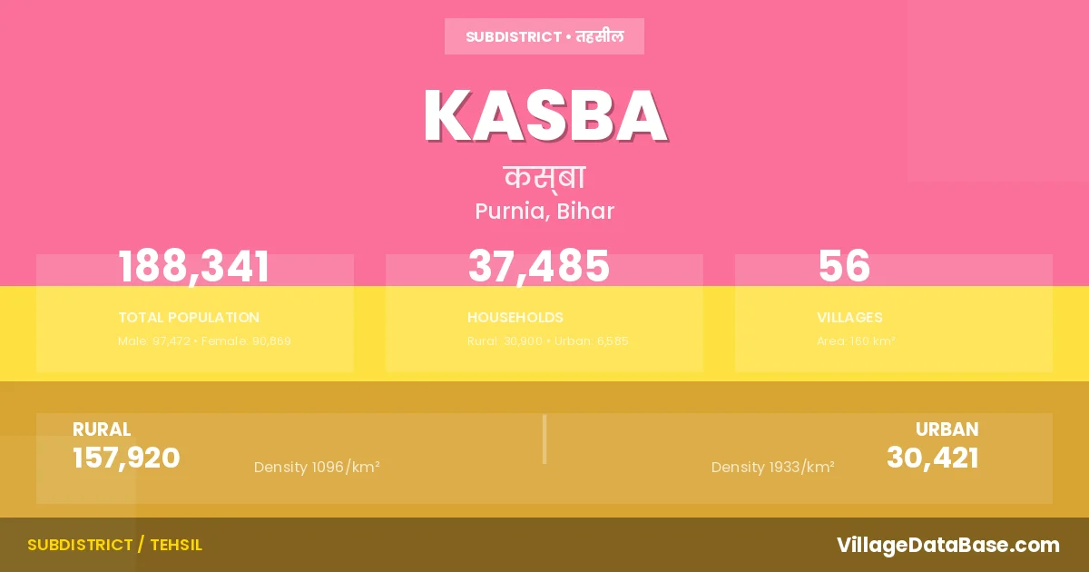 Kasba is a town and Subdivision in the Purnia district of the Bihar. In India, a Subdivision is a subdivision of a district responsible for the administration and revenue collection of a specific area within the district. Subdivisions play a crucial role in the local governance structure, contributing significantly to the development and administration of their communities.