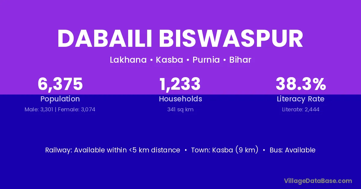 Dabaili Biswaspur village has a total population of 6,375 people, of which 3,301 are males and 3,074 are females.