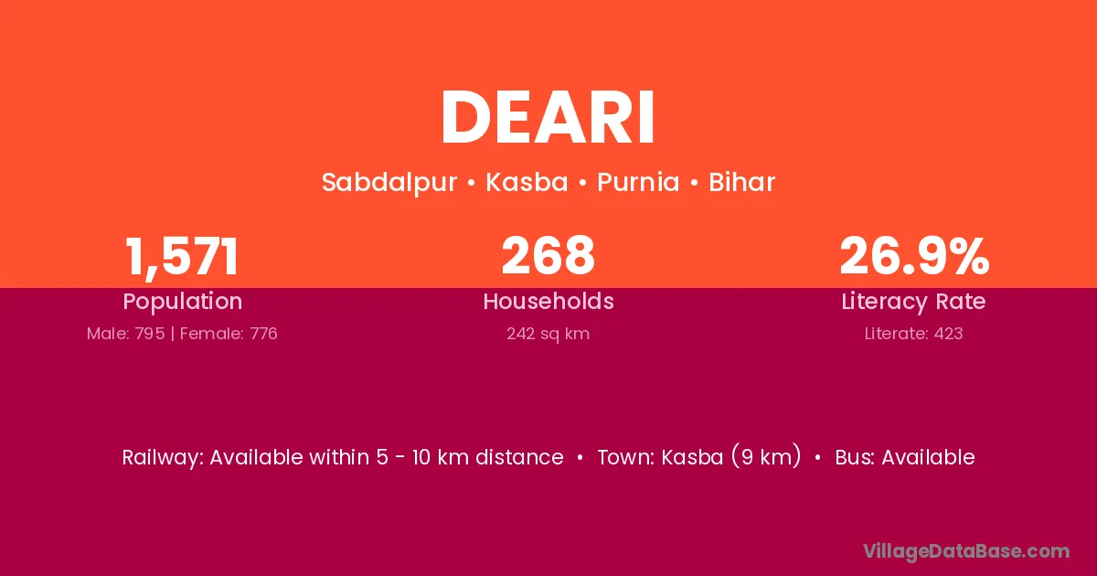Kasba (9 km) is the nearest town to Deari village for major economic activities and is located approximately 9 km away.