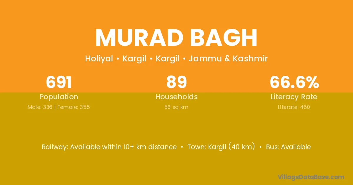 Kasba (13 km) is the nearest town to Murad Bagh village for major economic activities and is located approximately 13 km away.