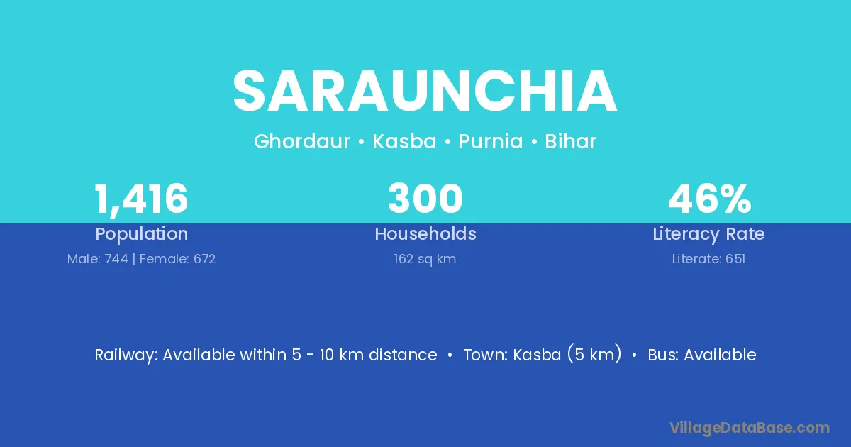 Saraunchia village has a total population of 1,416 people, of which 744 are males and 672 are females.