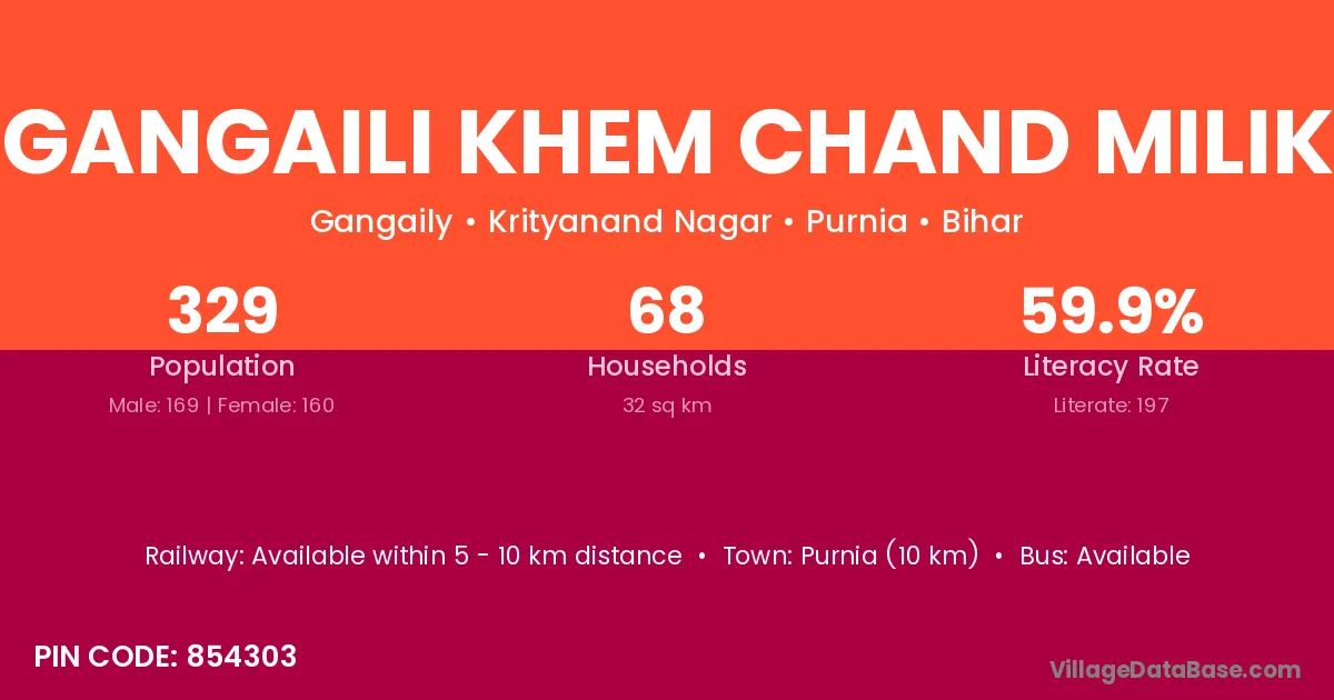 Purnia (10 km) is the nearest town to Gangaili Khem Chand Milik village for major economic activities and is located approximately 10 km away.