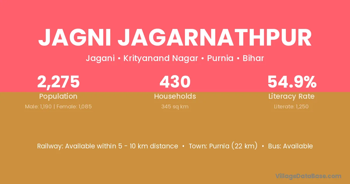 Purnia (22 km) is the nearest town to Jagni Jagarnathpur village for major economic activities and is located approximately 22 km away.