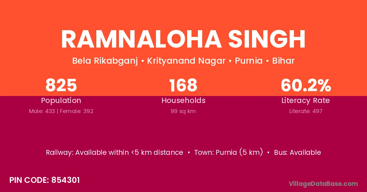 Purnia (5 km) is the nearest town to Ramnaloha Singh village for major economic activities and is located approximately 5 km away.