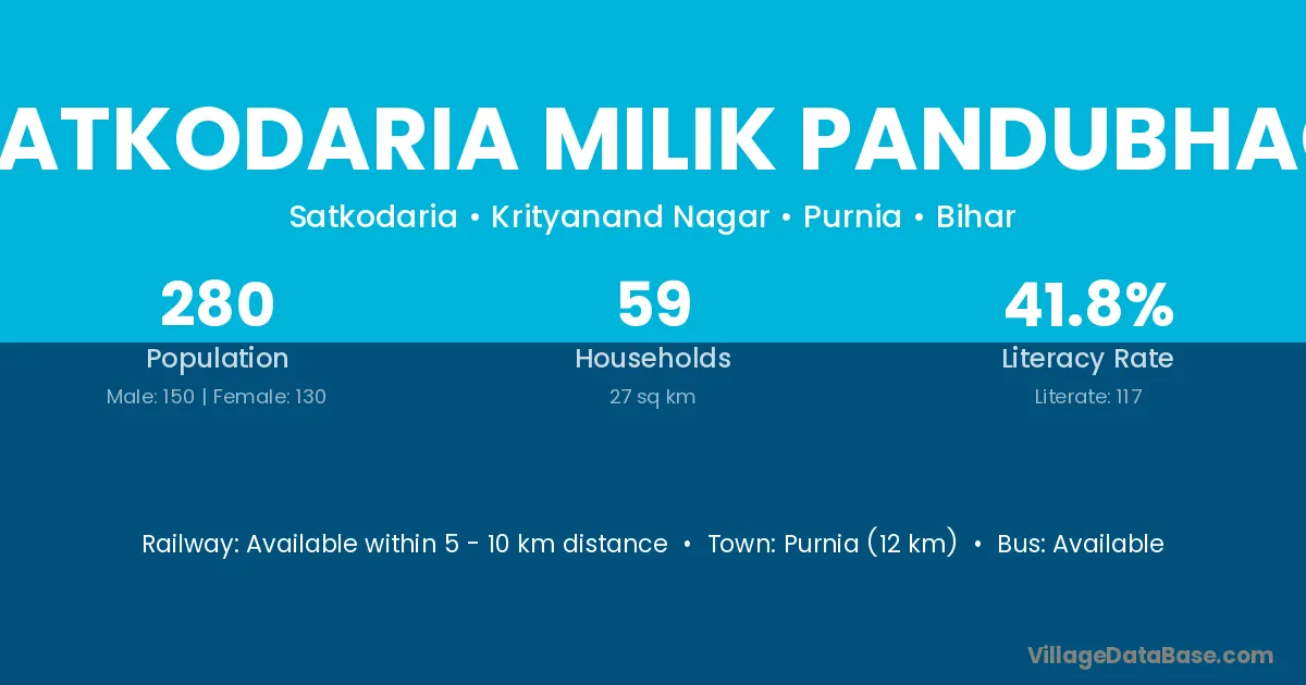 Purnia (12 km) is the nearest town to Satkodaria Milik Pandubhag village for major economic activities and is located approximately 12 km away.