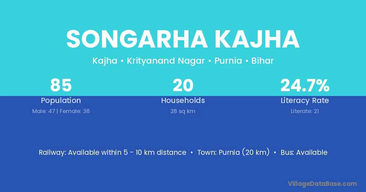 Purnia (20 km) is the nearest town to Songarha Kajha village for major economic activities and is located approximately 20 km away.