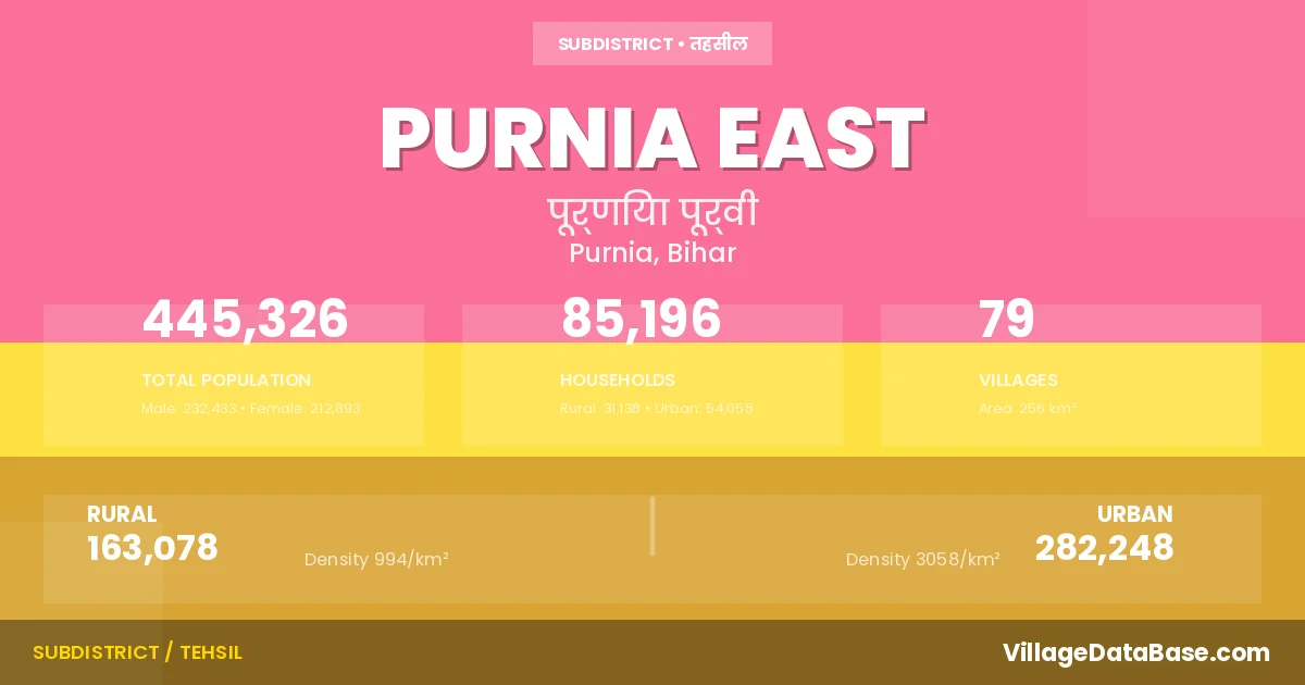 According to the 2011 census The total area of Purnia East Subdivision is 256 km², with a population of 445326 people. The population density is 1,737 inhabitants per square kilometre, and there are approximately 85196 houses in the sub district.