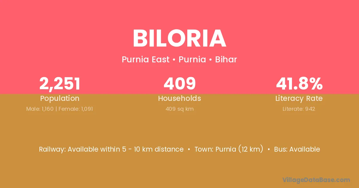 Purnia (12 km) is the nearest town to Biloria village for major economic activities and is located approximately 12 km away.