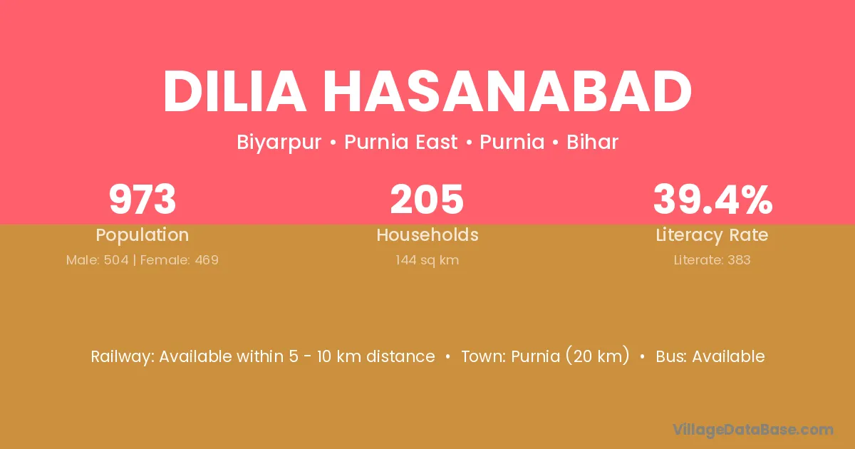 Purnia (20 km) is the nearest town to Dilia Hasanabad village for major economic activities and is located approximately 20 km away.