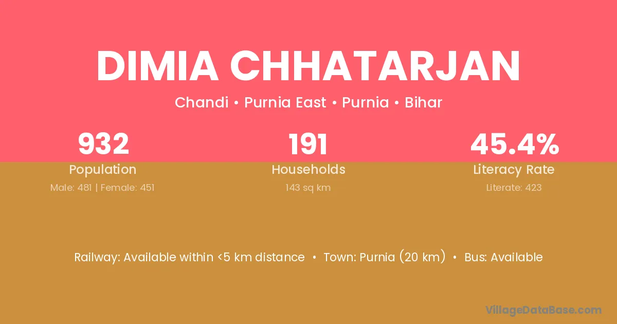 Purnia (20 km) is the nearest town to Dimia Chhatarjan village for major economic activities and is located approximately 20 km away.