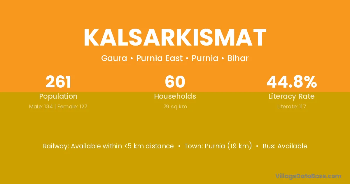 Purnia (19 km) is the nearest town to Kalsarkismat village for major economic activities and is located approximately 19 km away.