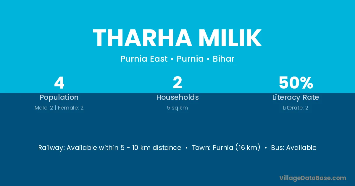 Purnia (16 km) is the nearest town to Tharha Milik village for major economic activities and is located approximately 16 km away.