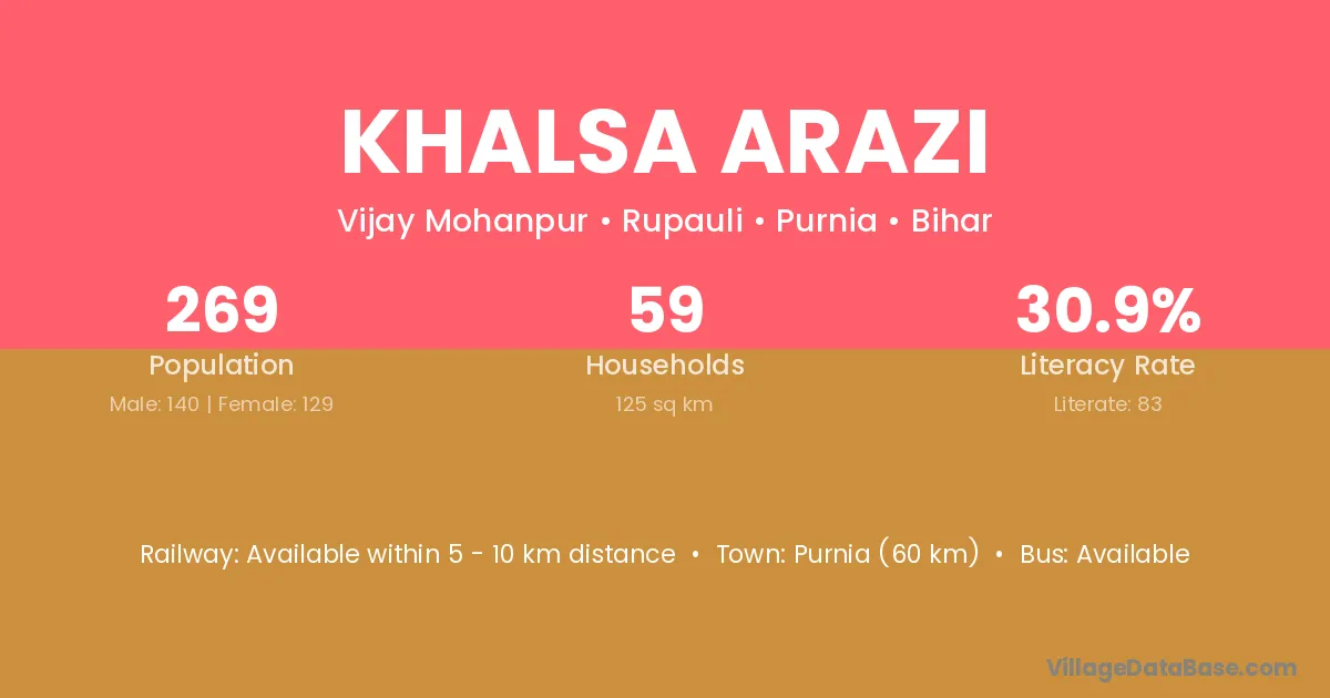 Purnia (60 km) is the nearest town to Khalsa Arazi village for major economic activities and is located approximately 60 km away.