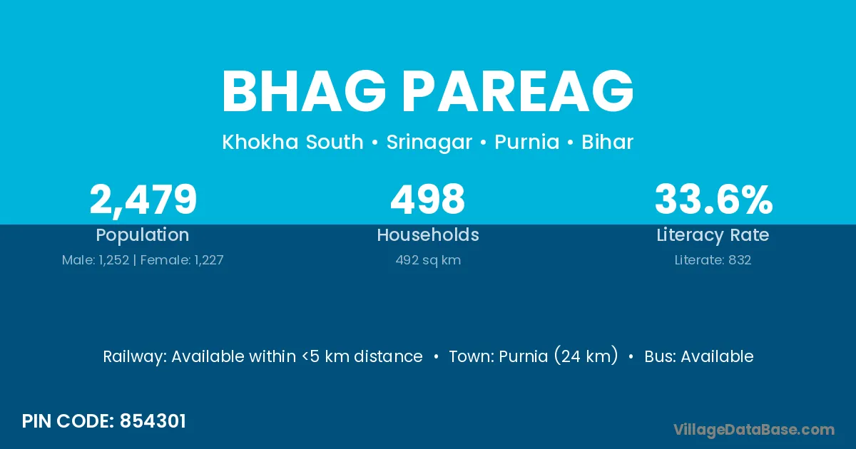 Purnia (24 km) is the nearest town to Bhag Pareag village for major economic activities and is located approximately 24 km away.