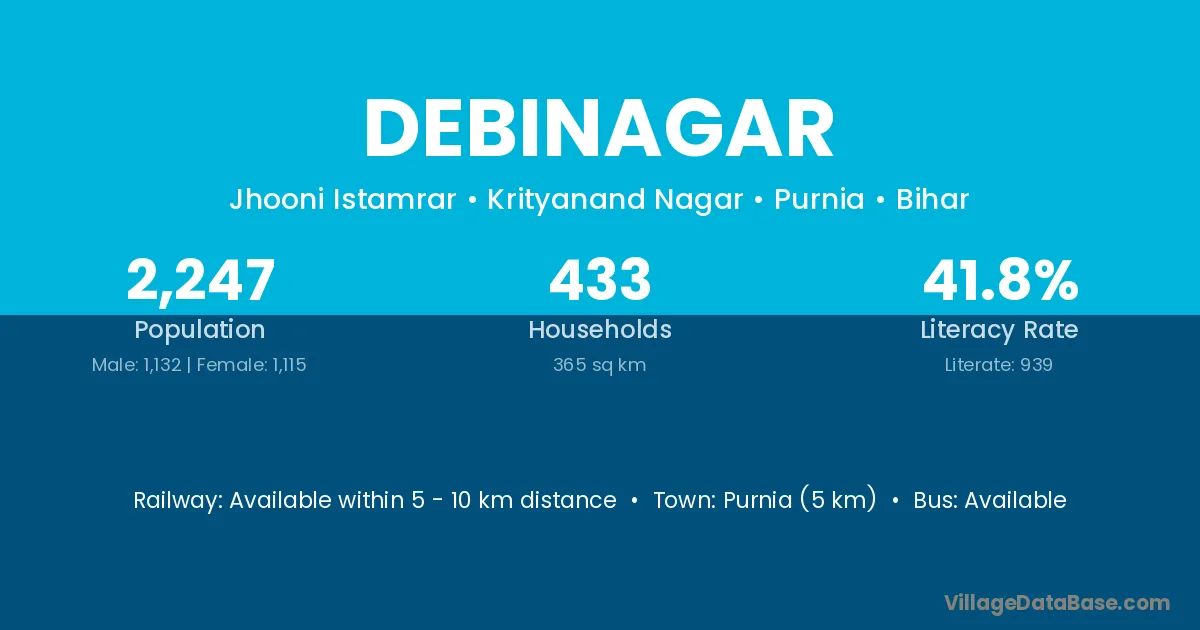 Purnia (18 km) is the nearest town to Debinagar village for major economic activities and is located approximately 18 km away.