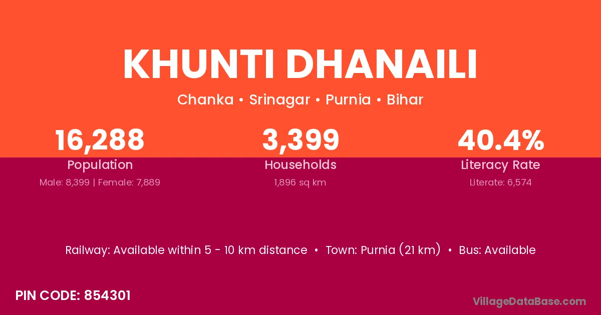 Purnia (21 km) is the nearest town to Khunti Dhanaili village for major economic activities and is located approximately 21 km away.