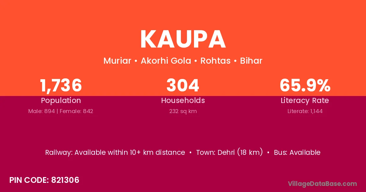 Dehri (18 km) is the nearest town to Kaupa village for major economic activities and is located approximately 18 km away.
