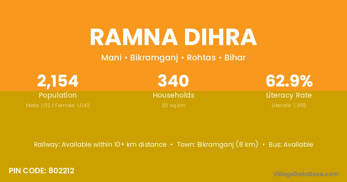 Bikramganj (8 km) is the nearest town to Ramna Dihra village for major economic activities and is located approximately 8 km away.