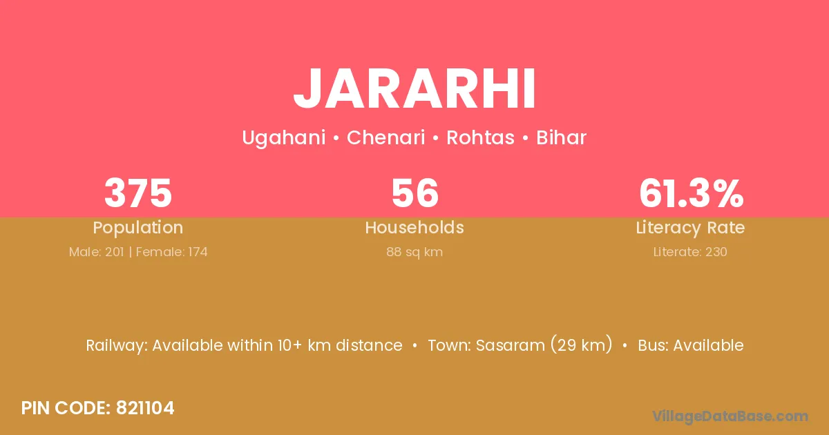 Sasaram (29 km) is the nearest town to Jararhi village for major economic activities and is located approximately 29 km away.