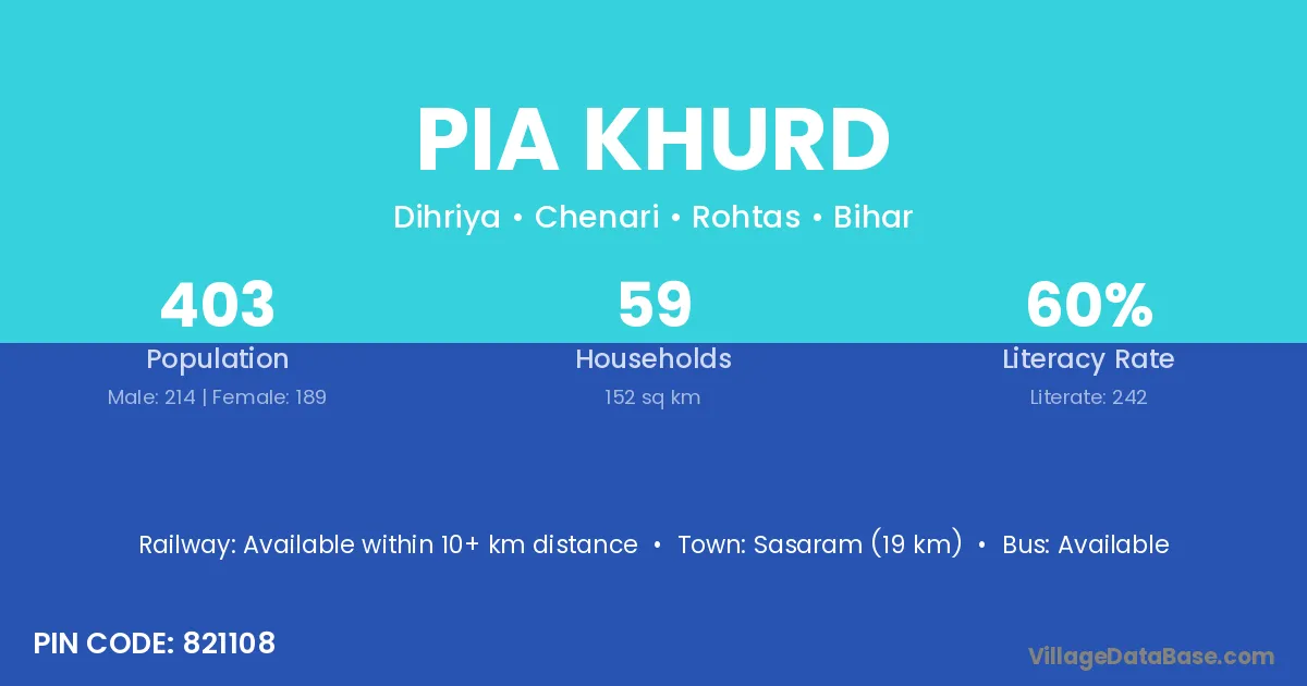 Sasaram (19 km) is the nearest town to Pia Khurd village for major economic activities and is located approximately 19 km away.