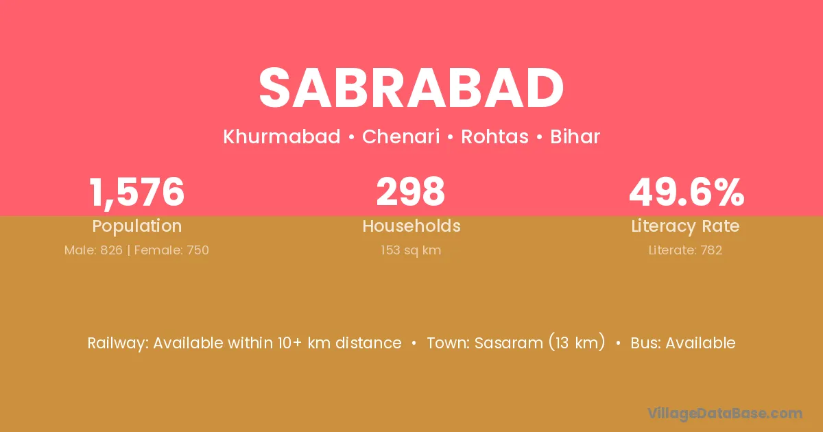 Sasaram (13 km) is the nearest town to Sabrabad village for major economic activities and is located approximately 13 km away.