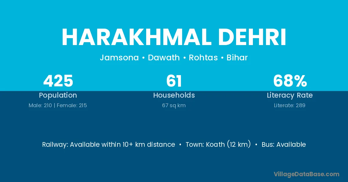 Koath (12 km) is the nearest town to Harakhmal Dehri village for major economic activities and is located approximately 12 km away.