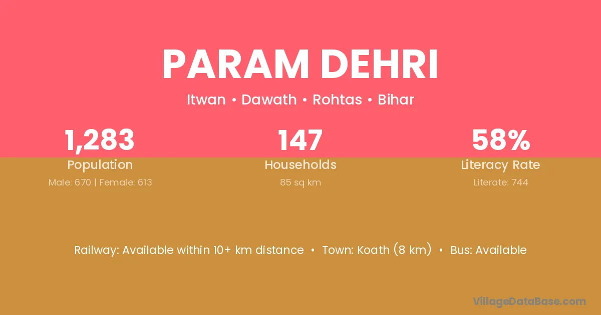 Koath (8 km) is the nearest town to Param Dehri village for major economic activities and is located approximately 8 km away.