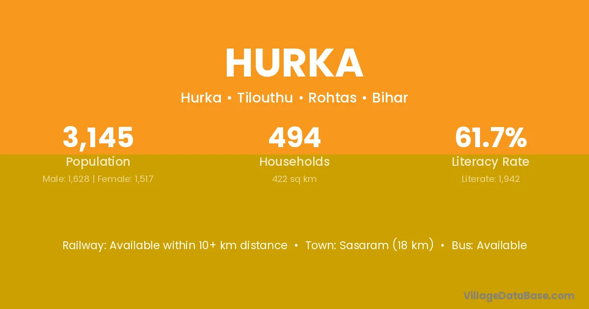 Dehri (4 km) is the nearest town to Hurka village for major economic activities and is located approximately 4 km away.