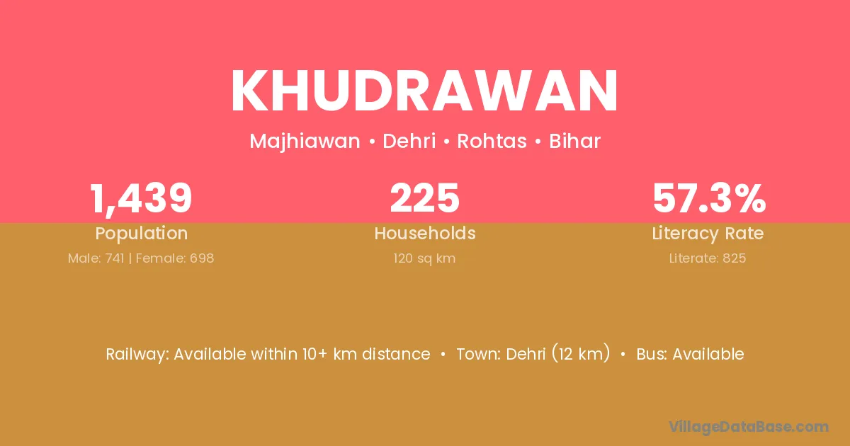 Dehri (12 km) is the nearest town to Khudrawan village for major economic activities and is located approximately 12 km away.