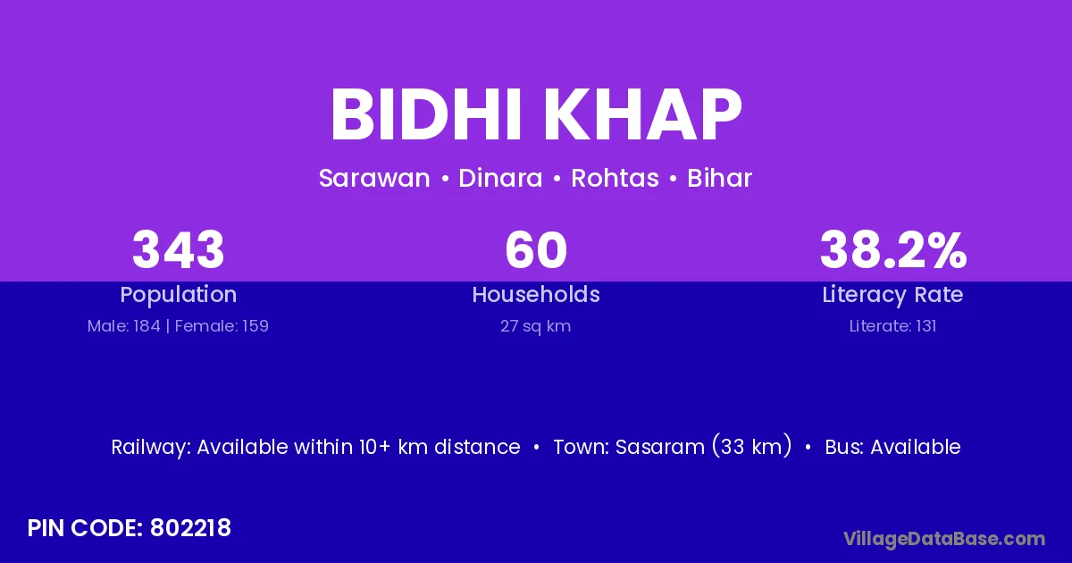 Sasaram (33 km) is the nearest town to Bidhi Khap village for major economic activities and is located approximately 33 km away.