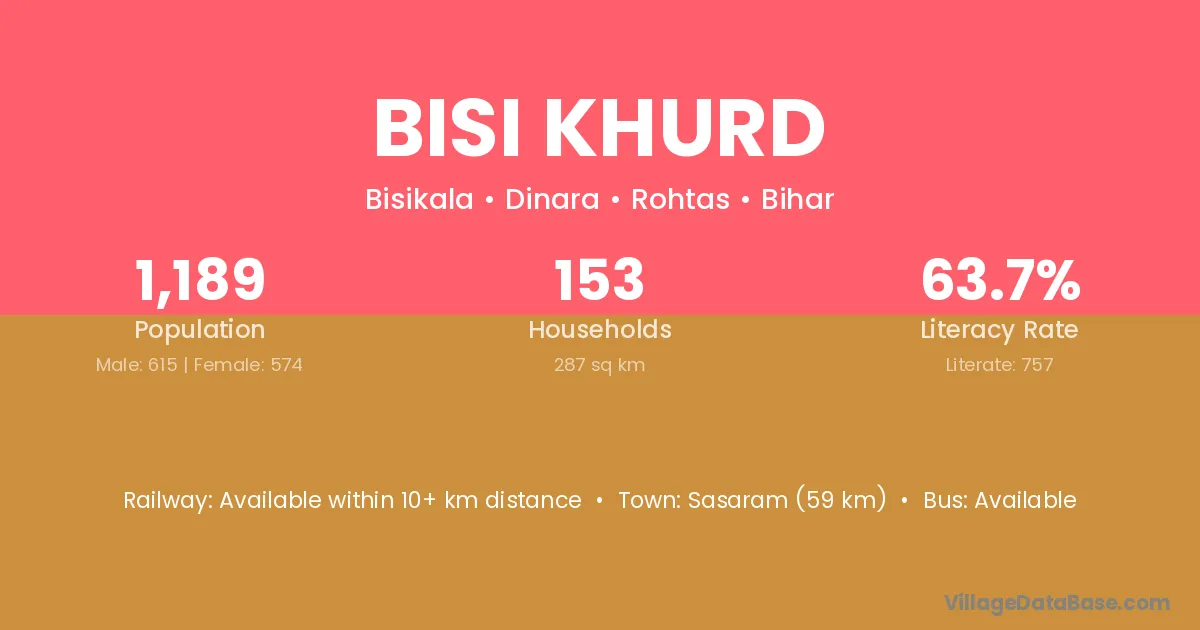 Sasaram (59 km) is the nearest town to Bisi Khurd village for major economic activities and is located approximately 59 km away.