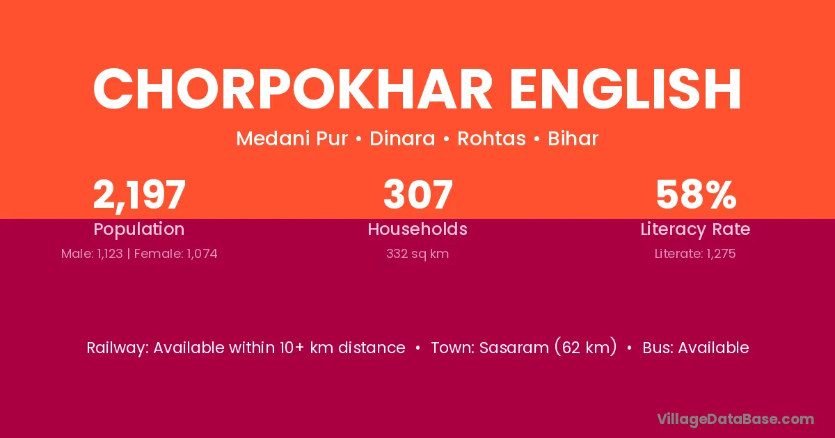 Sasaram (62 km) is the nearest town to Chorpokhar English village for major economic activities and is located approximately 62 km away.