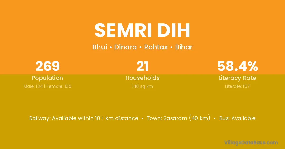 Sasaram (40 km) is the nearest town to Semri Dih village for major economic activities and is located approximately 40 km away.