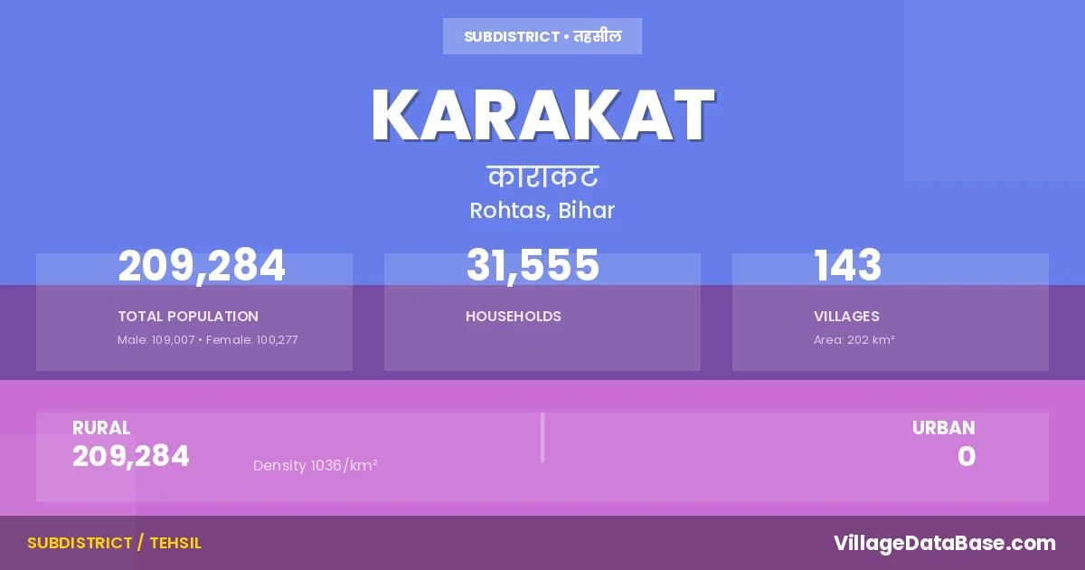 According to the 2011 census The total area of Karakat Subdivision is 202 km², with a population of 209284 people. The population density is 1,036 inhabitants per square kilometre, and there are approximately 31555 houses in the sub district.