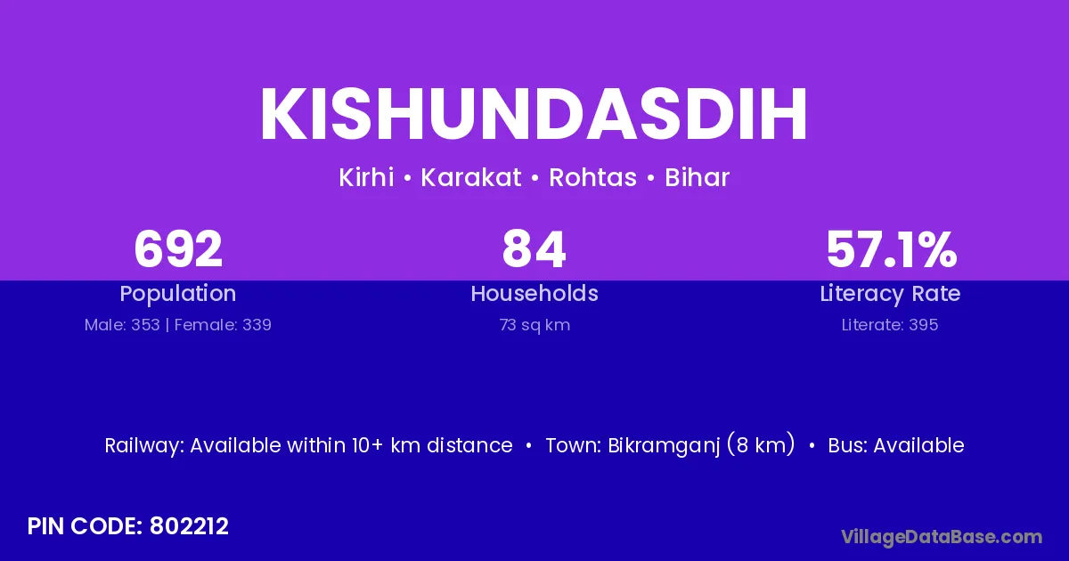 Bikramganj (8 km) is the nearest town to Kishundasdih village for major economic activities and is located approximately 8 km away.