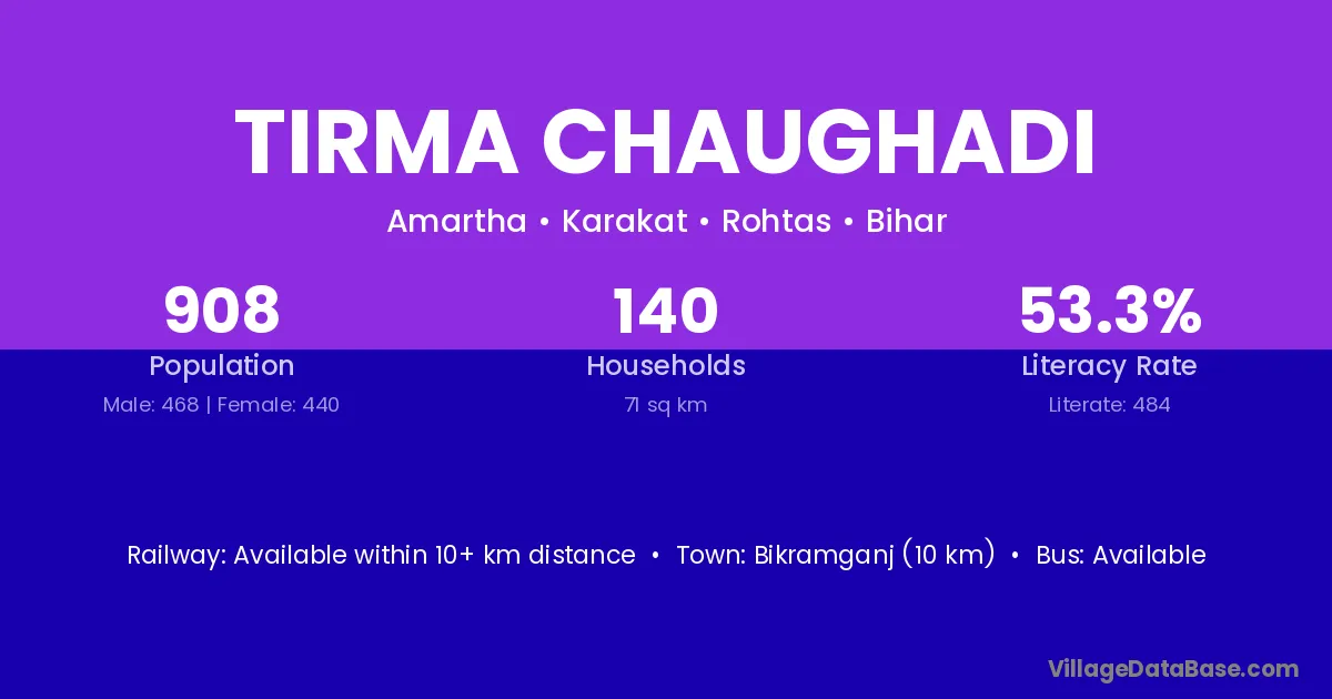 Bikramganj (10 km) is the nearest town to Tirma Chaughadi village for major economic activities and is located approximately 10 km away.