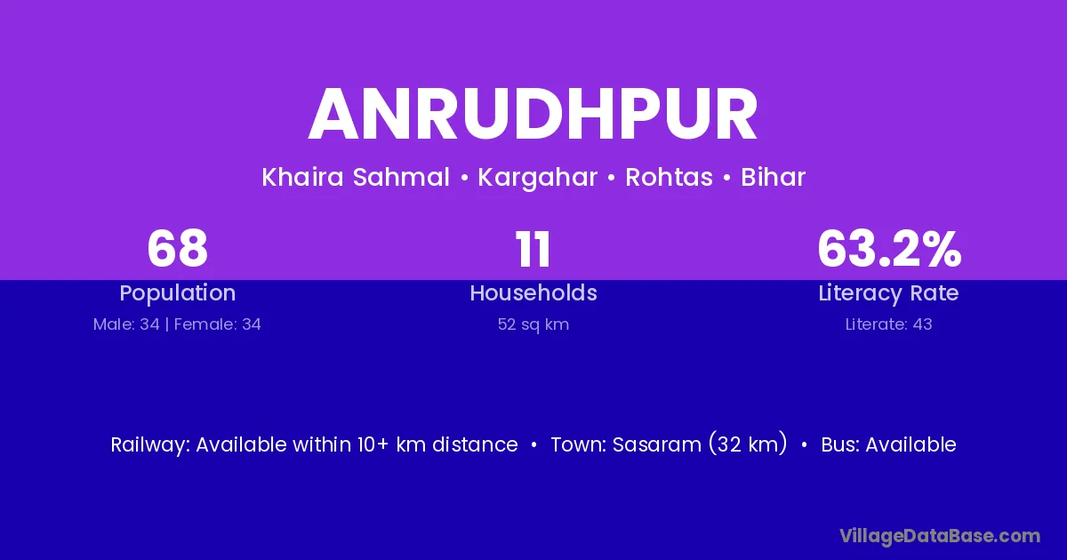 Sasaram (32 km) is the nearest town to Anrudhpur village for major economic activities and is located approximately 32 km away.