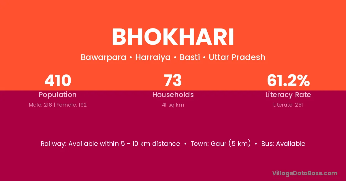The literacy rate of Bhokhari village is 70.78%. Male literacy stands at 78.61% and female literacy at 62.18%.