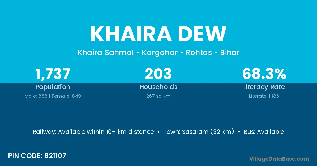 Sasaram (32 km) is the nearest town to Khaira Dew village for major economic activities and is located approximately 32 km away.
