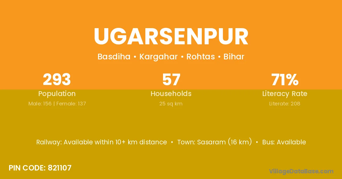 Sasaram (16 km) is the nearest town to Ugarsenpur village for major economic activities and is located approximately 16 km away.