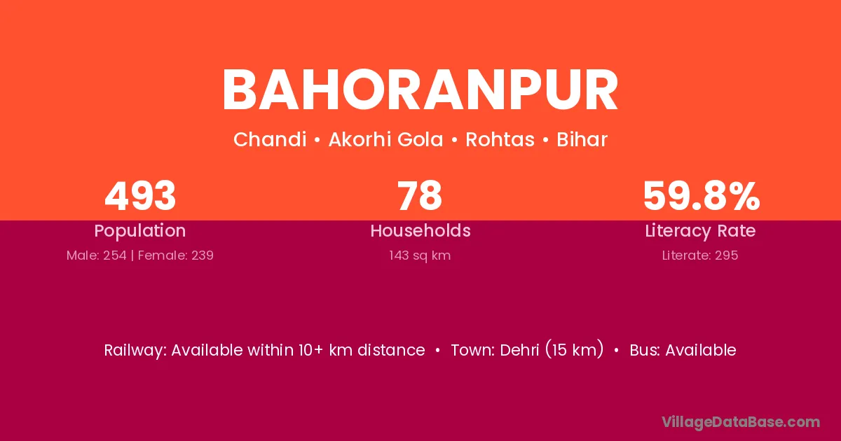 Sasaram (33 km) is the nearest town to Bahoranpur village for major economic activities and is located approximately 33 km away.