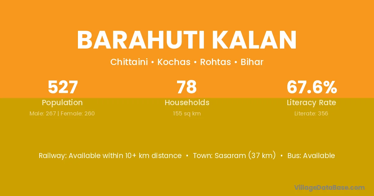 Sasaram (37 km) is the nearest town to Barahuti Kalan village for major economic activities and is located approximately 37 km away.