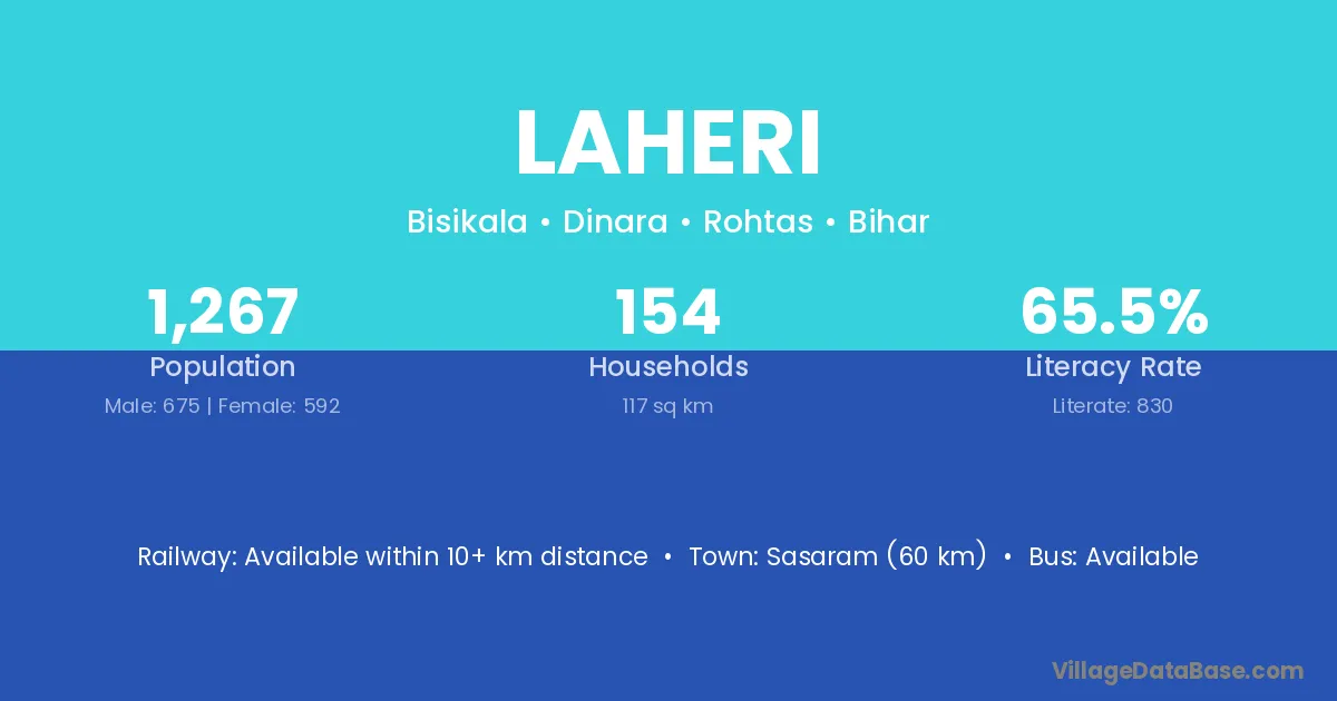 Sasaram (35 km) is the nearest town to Laheri village for major economic activities and is located approximately 35 km away.