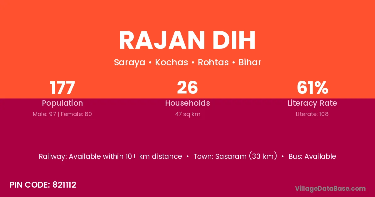Sasaram (33 km) is the nearest town to Rajan Dih village for major economic activities and is located approximately 33 km away.