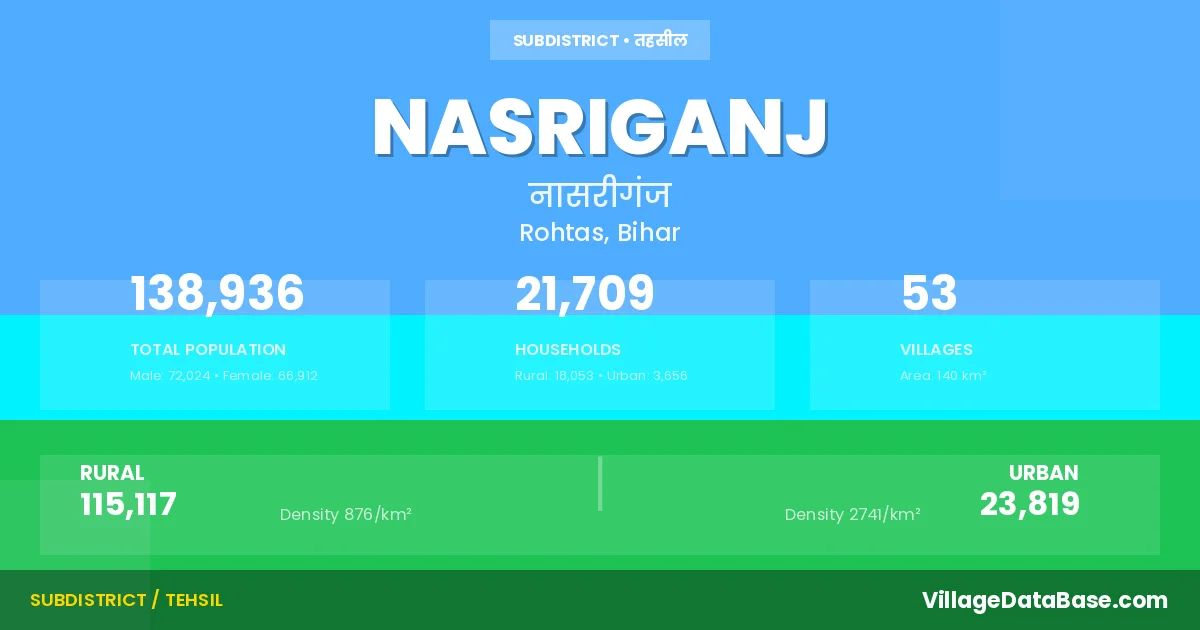 Nasriganj is a town and Subdivision in the Rohtas district of the Bihar. In India, a Subdivision is a subdivision of a district responsible for the administration and revenue collection of a specific area within the district. Subdivisions play a crucial role in the local governance structure, contributing significantly to the development and administration of their communities.
