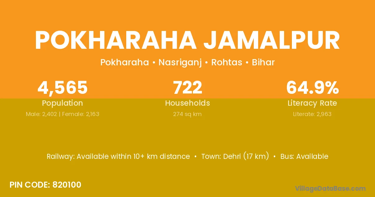 Dehri (17 km) is the nearest town to Pokharaha Jamalpur village for major economic activities and is located approximately 17 km away.
